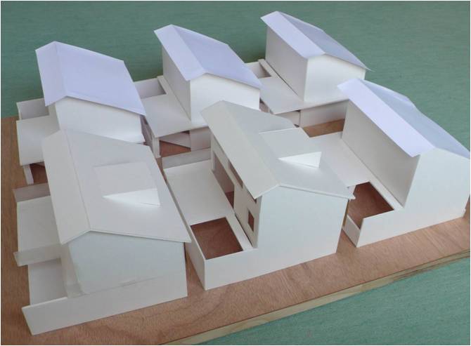市街地において良質な住環境と経済性を両立しうる住宅プロトタイプを提案する。 戸当たり100平米程度の敷地面積を想定し、一部に3階建を導入。2階に広いテラスを設けた点が特徴。 地方都市の暮らしに配慮し、駐車場を2台確保することができる。